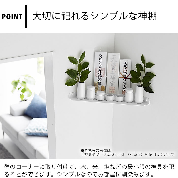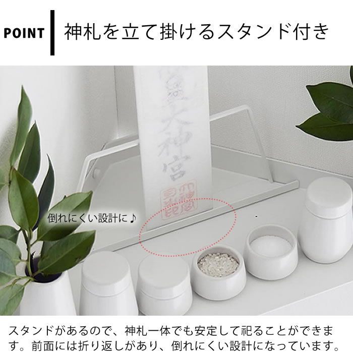水、米、塩などの最小限の神具を祀ることができます。スタンドの先には折り返しがあるので神札一体でも安定して祀ることができます。