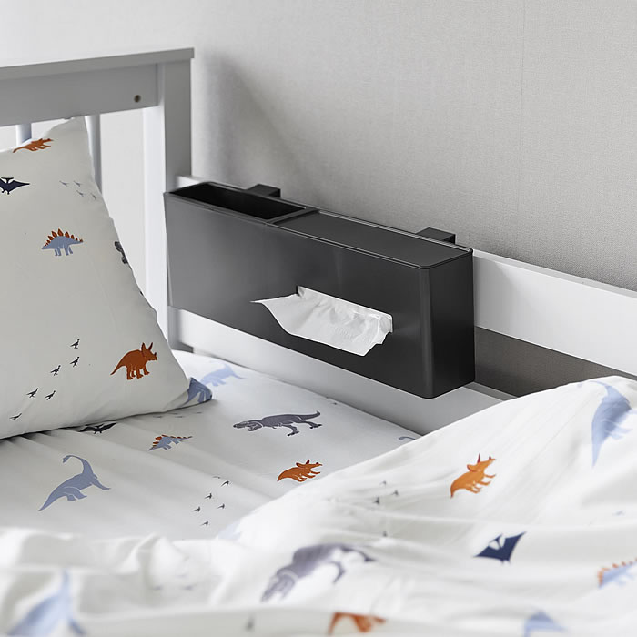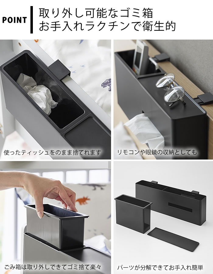 2段ベッドのフレームなどの手に取りやすい場所に浮かせて設置できます。ダストボックス付きで、ゴミをすぐに捨てることができます。