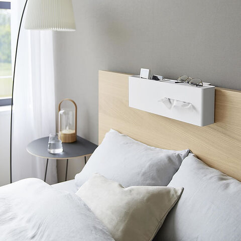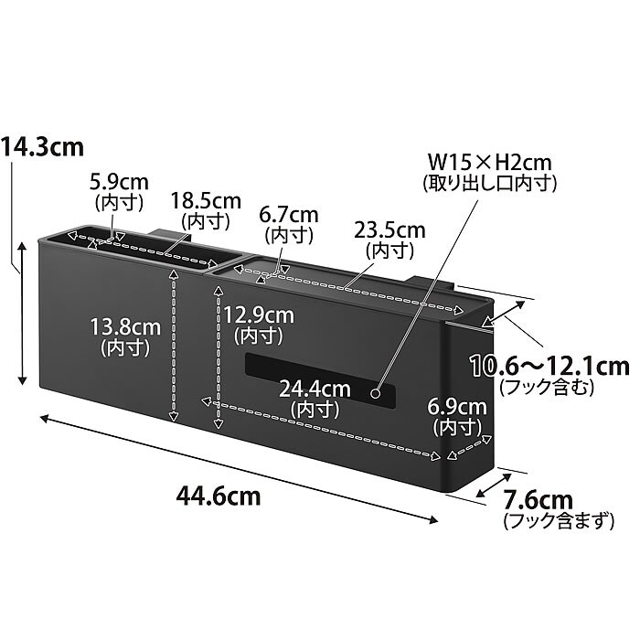 サイズ 外寸:W44.6×D7.6×H14.3cm(フック含まず) W44.6×D10.6~12.1×H14.3cm(フック含む) ティッシュケース:W24.4×D6.9×H12.9cm トレー部:W23.5×D6.7cm ダストボックス(開口部):W18.5×D5.9×H13.8cm |