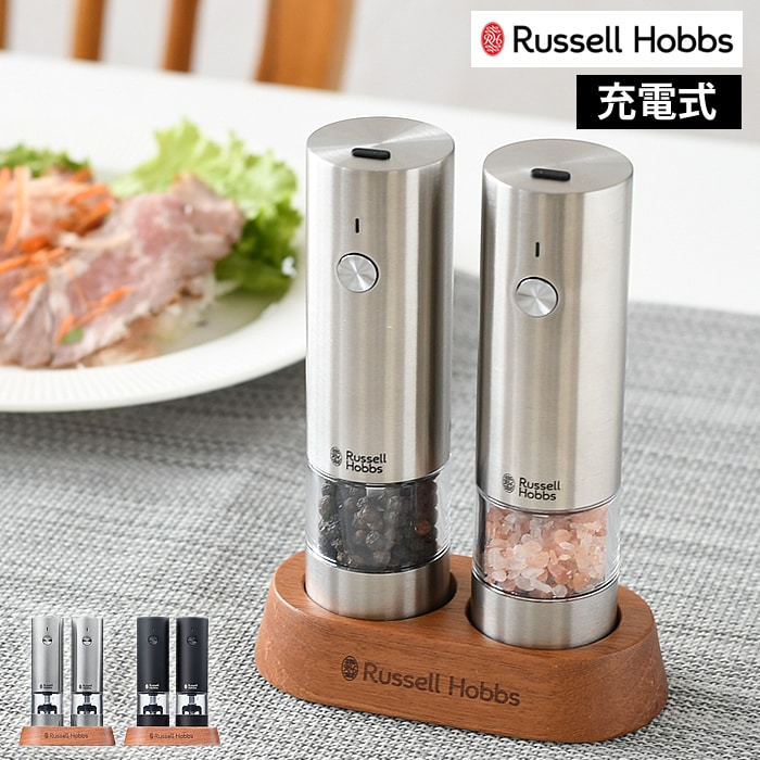 Russell Hobbs ラッセルホブス 充電式ミル ソルト&ペッパー ミニ 2本セット 電動ミル スパイスミル ペッパーミル 専用スタンド付 ワンプッシュ 電池不要 片手 岩塩 ペッパー 胡椒