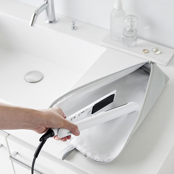 熱いまま収納OK ヘアーアイロンを熱いまま収納できる! 吊り下げても置いても出し入れ簡単な耐熱ヘアーアイロンポーチ。 ストラップはボタン開閉式なのでタオルバーなどにも吊り下げられます。 裏生地は耐熱温度300℃なので使用中のヘアーアイロンを熱いまま置いても安心。 ファスナー付きポケットには電源コードが収納でき、出し入れもスムーズです。 ![]() ![]() ![]() ![]() ![]() ![]() ![]() ![]() |