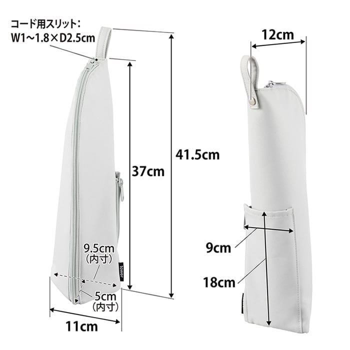内寸サイズ 底面:約 W9.5×D5cm コード用スリット:約 W1~1.8×D2.5cm ストラップ内周:約 13cm ポケット:約 W9×H18cm |