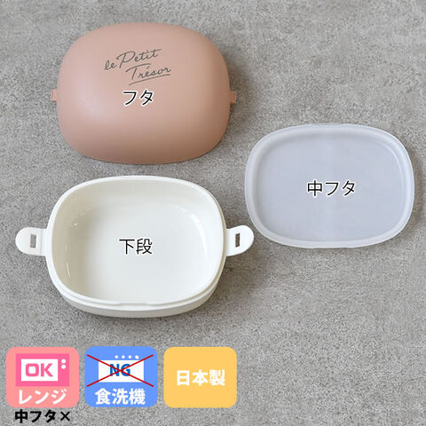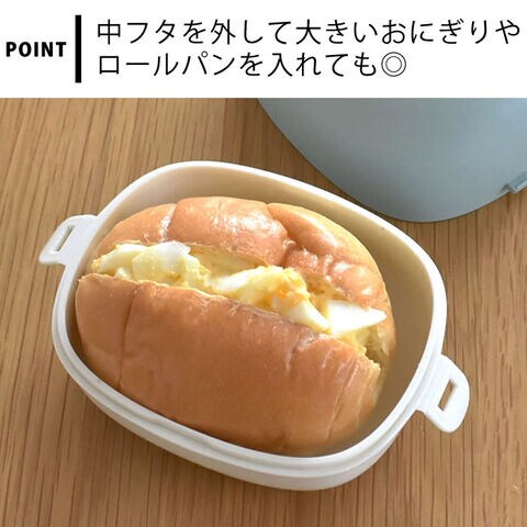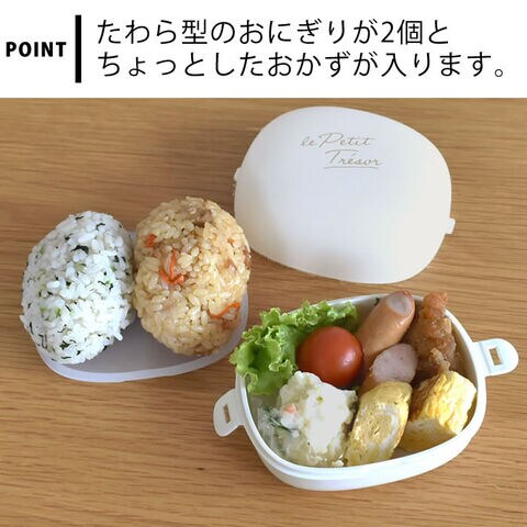 ざらっとした手触りで高級感のある「トレゾワ おにぎりケース」。 俵型のおにぎり2個と、おかずケース部分の容量250mlでサラダやちょっとしたおかずが入れられます。 ケース表面は傷や指紋が付きにくい素材で、中ブタを外して大きいおにぎりやロールパンケースとしても使えます。 中ブタを外せば電子レンジOK、安心の日本製です。