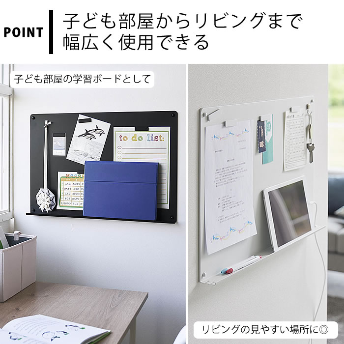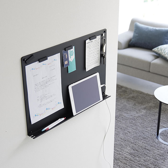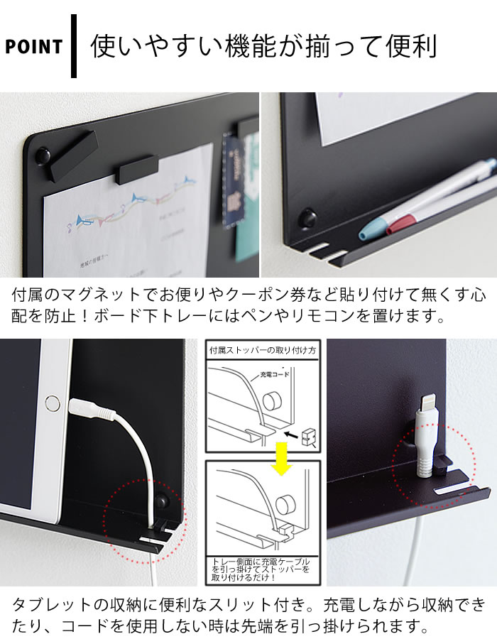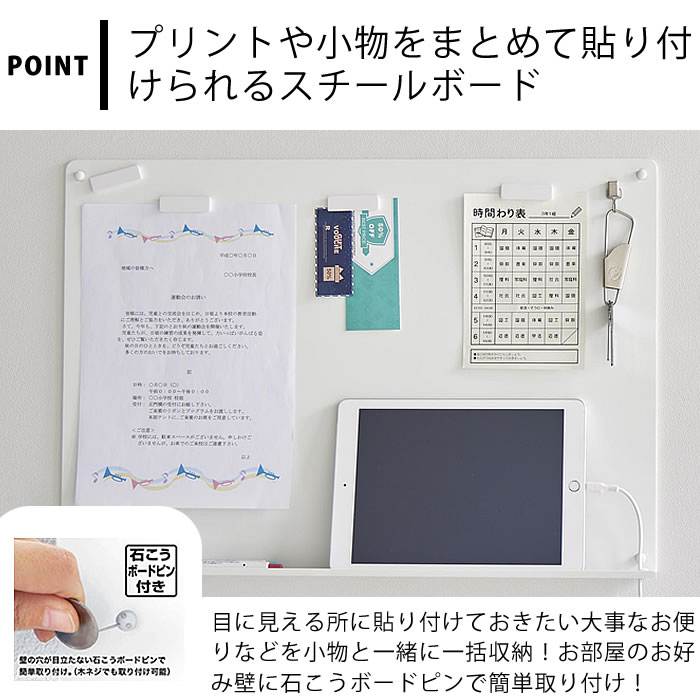 子供部屋やリビングなどに リビングや子ども部屋など、お家の好きな壁に簡単に取り付けられるスチールボード。リビングではチラシやクーポン券などを目の届く所に管理できるので便利。子ども部屋では、学校の学習用プリントや時間割などを付属のマグネットでピタッと貼り付けて忘れ物防止に。タブレットの収納にも便利なトレー付き。付属のストッパーで、ホルダーに引っ掛けた充電ケーブルの落下を防止できます。 ![]() ![]() ![]() ![]() ![]() ![]() ![]() ![]() |