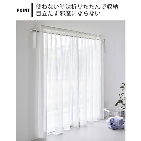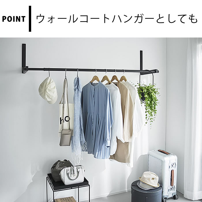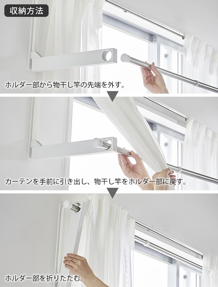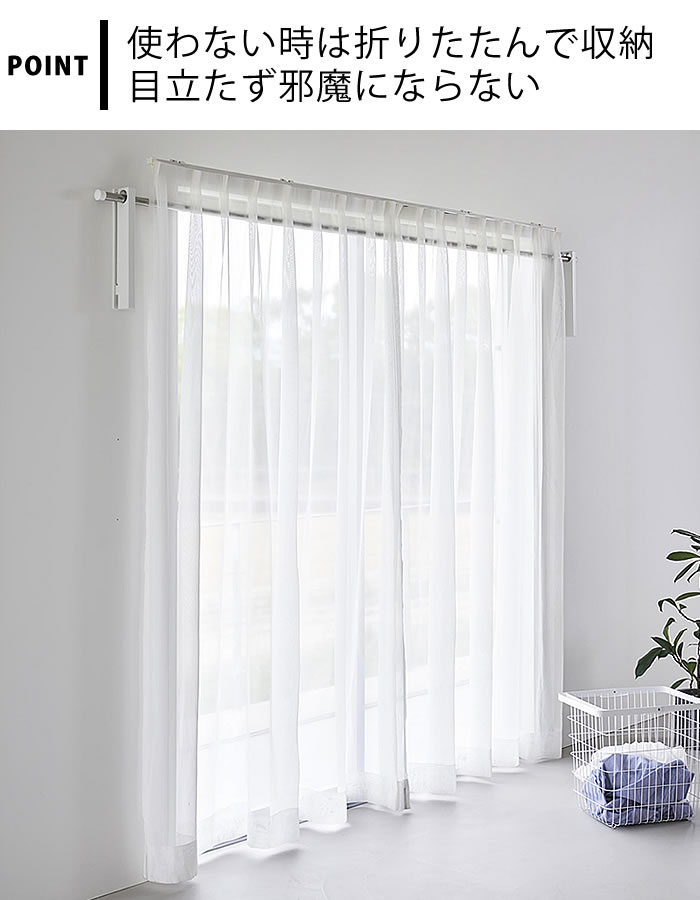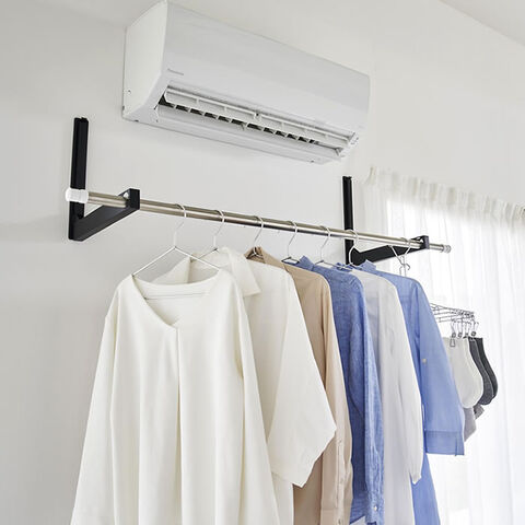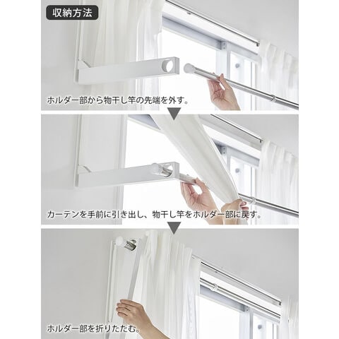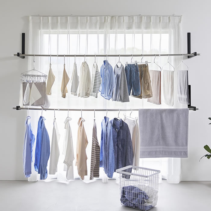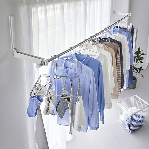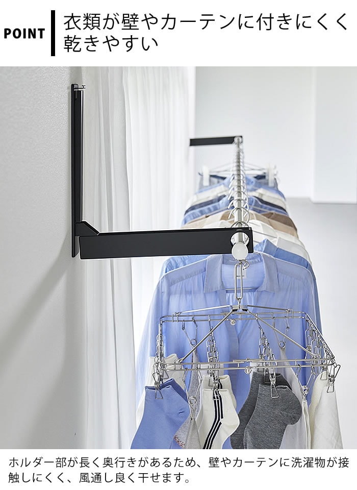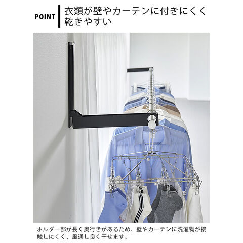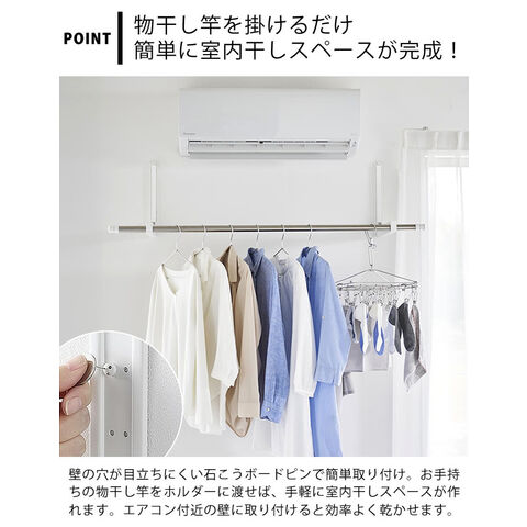 壁の穴が目立ちにくい石こうボードピンで簡単取り付け。お手持ちの物干し竿を掛けるだけで手軽に室内干しスペースが作れます。使用しない時は折りたためるので、物干し竿の置き場所に困りません。ホルダー部は奥行きがあるため衣類が壁やカーテンに付きにくく、乾きやすい設計。ウォールコートハンガーとしてもインテリアに馴染みます。