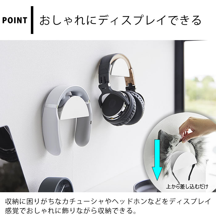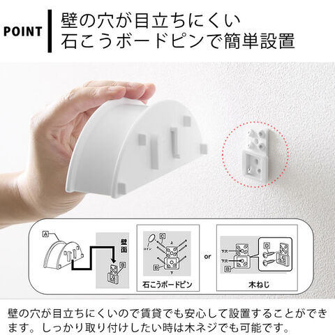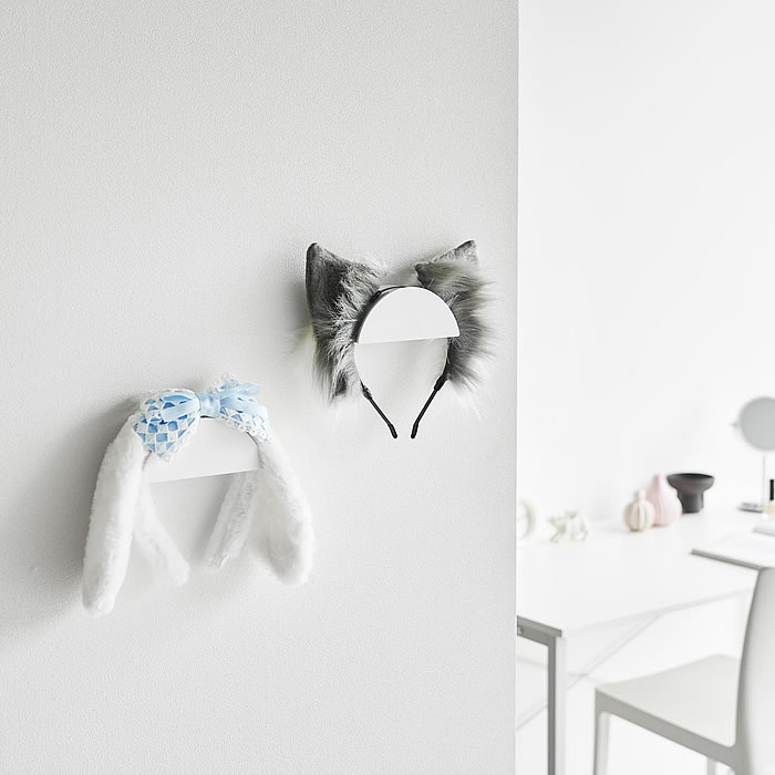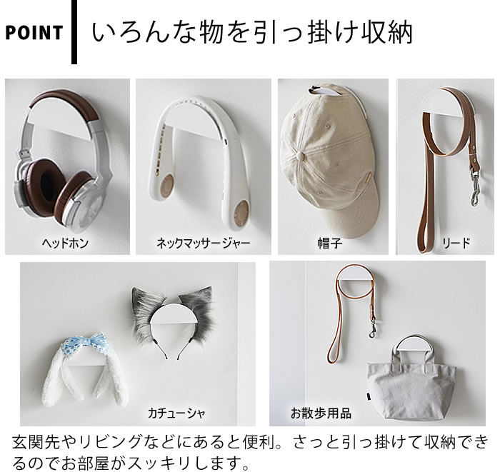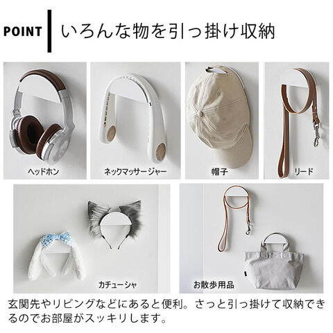 収納に困るカチューシャを浮かせてディスプレイ収納。差し込むだけの簡単収納!ヘッドホンの壁掛けや収納に困りがちなネックマッサージャーの収納にも。外出時の必需品やペットのお散歩グッズなどの収納に玄関への設置もおすすめです。壁の穴が目立たない石こうボードピンで簡単取り付け。(木ネジでも取り付け可能)なので賃貸などでも安心して取り付けできます。