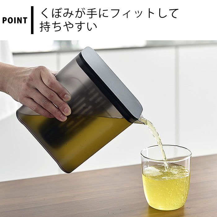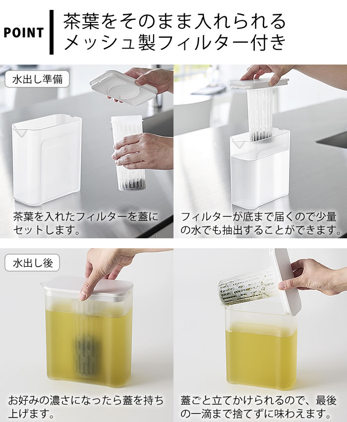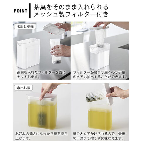 冷蔵庫にスッキリ収まる 冷蔵庫の下段やドアポケットにすっきり収まるサイズで、茶葉をそのまま入れられるメッシュ製フィルター付きの冷水筒です。茶葉やお出汁を水出しする際、フィルターが底まで届くので少量の水でも抽出することができます。くぼみが手にフィットし、しっかりと持ちやすい形状。開口部が広いので洗いやすく、パッキンレスでお手入れラクラク。食洗機にも対応しています。 ![]() ![]() ![]() ![]() ![]() ![]() ![]() ![]() ![]() |