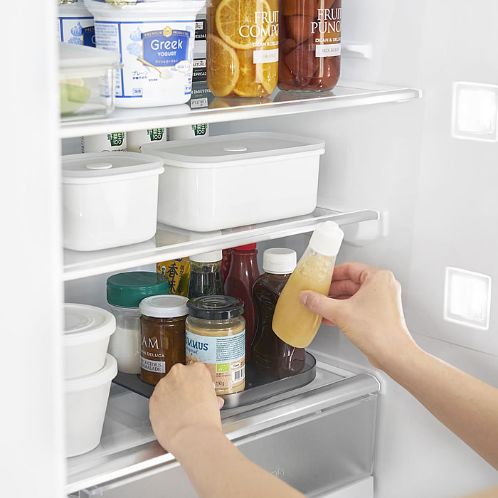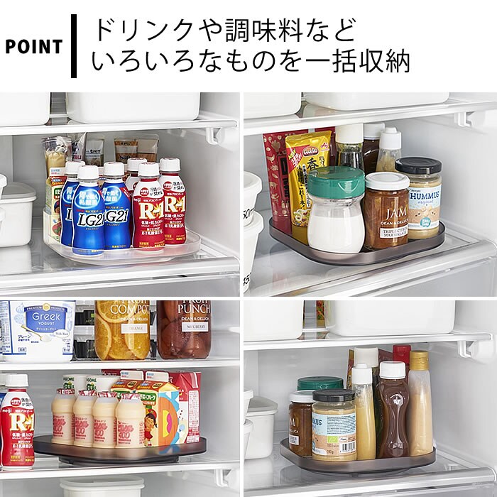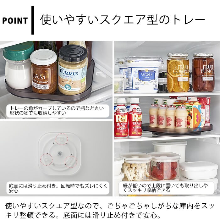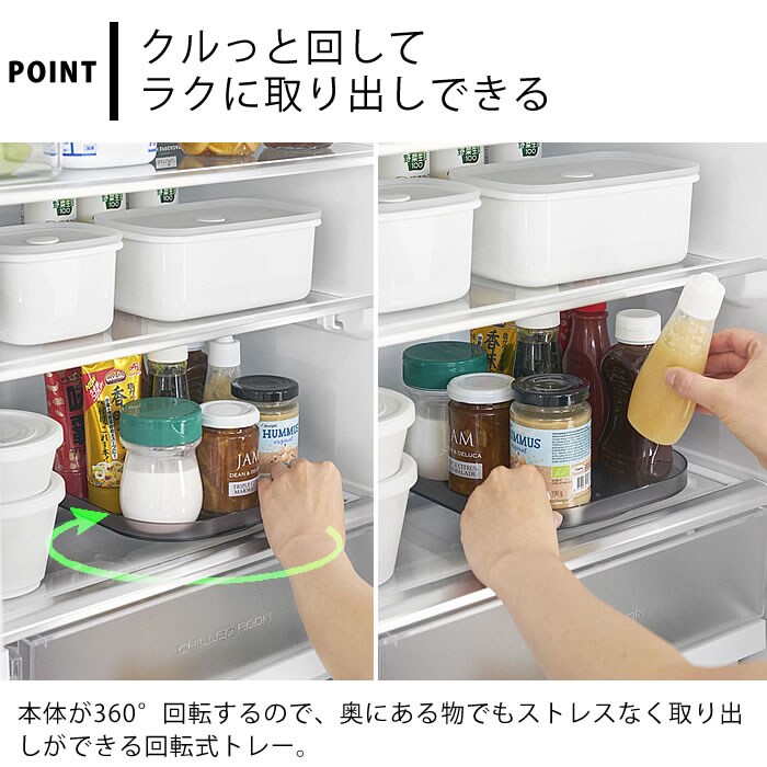 ごやごちゃしがちな冷蔵庫中の調味料やジャムの瓶などをまとめてすっきり整頓!奥の物が取り出しやすい回転式のトレーです。奥にある物もクルっと360℃回転させることで楽に取り出すことができ、底面には滑り止めがついているのでトレーを回転させてもずれにくく安心です。トレーの縁が浅いので、高さのない上段に置いても取り出しやすく便利です。