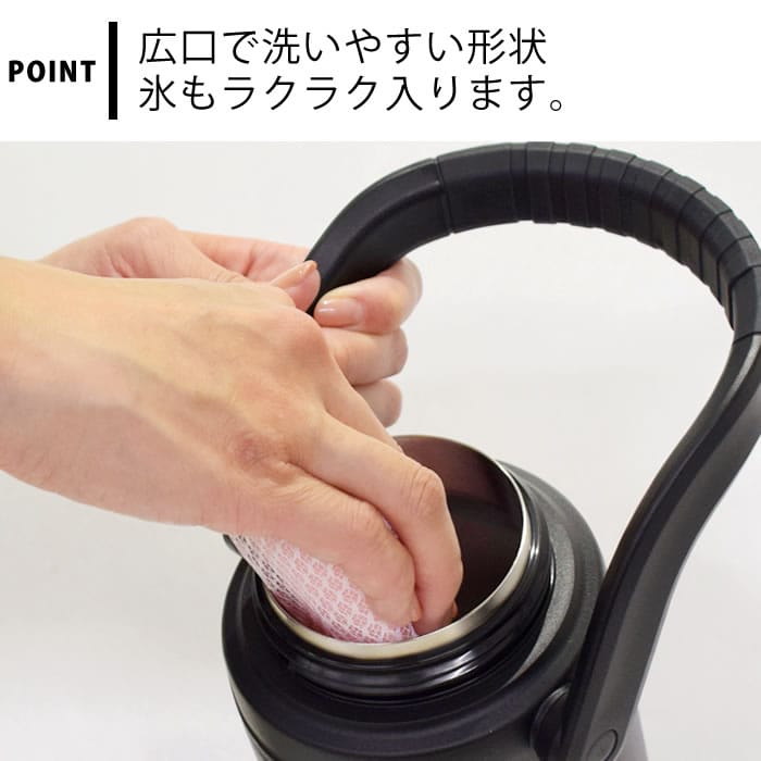 フタはワンプッシュ開閉でそのまま飲める細口タイプで、氷が入れやすく洗いやすい広口形状。