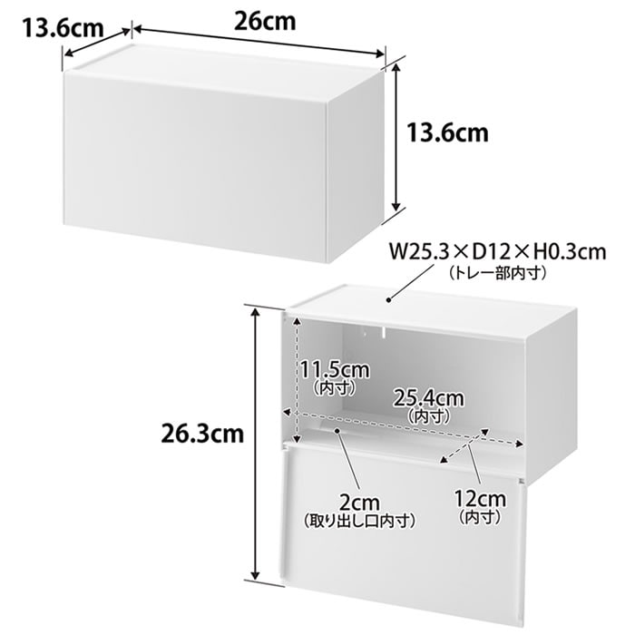 内寸サイズ 取り出し口:約 D2cm トレー部:約 W25.3×D12×H0.3cm |