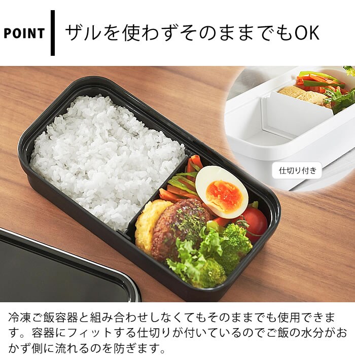 ごはんを美味しく温められる、別売の「冷凍ごはん容器」のザルをそのままセットできるランチボックスです。解凍したごはんをザルごとお弁当箱に移せるので、ごはんをよそう手間が省け、忙しい朝の時短に最適です。ザルを使わずそのままごはんを入れてもOK。バルブをプッシュして簡単密閉でき、パッキンが汁漏れを防ぐので食材の保存容器としてもおすすめです。蓋をしたまま電子レンジで加熱が可能で食洗機も冷凍も可能です。