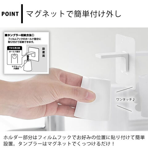 備考 | ※使用できる面 タンブラー:マグネットがつく平らな面・スチール面 フィルムフック:光沢のある平らな油染みしない面で、フィルムフックの接着面よりも大きい面(タイル・プラスチック・ステンレス・ガラス・鏡面(ミラー)・金属塗装面・人工大理石) | 検索キーワード | フィルムフックマグネットマウスウォッシュタンブラー タワー tower タンブラー 洗面 うがいコップ 洗口液 小さめ 洗面所 磁石 10131 10132 タワーシリーズ コップ 衛生的 浮かせて収納 山崎実業 yamazaki ヤマジツ 口臭ケア マグネット |