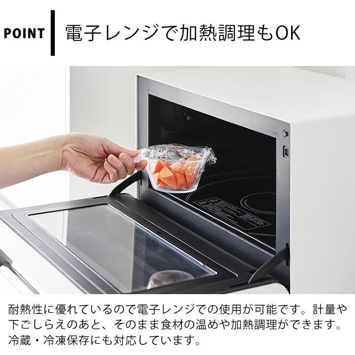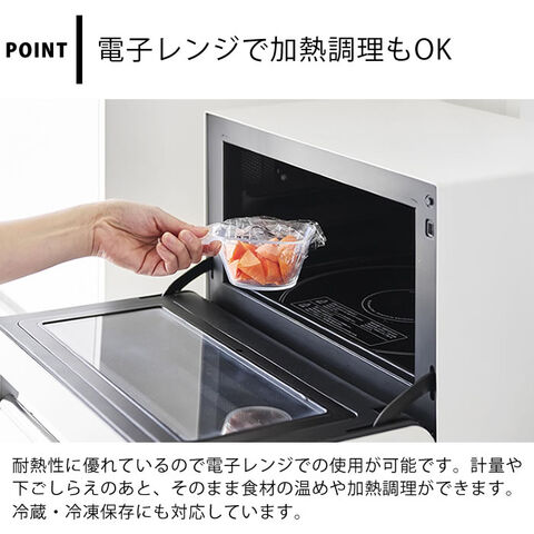 ※本製品は、家庭での調理・使用を目的としています。 ※電子レンジ以外で加熱しないでください。直火・グリル・オーブン・オーブントースター等は使用できません。 ※電子レンジの自動加熱機能は使用しないでください。 ※電子レンジで加熱の際は、耐熱温度内であっても長時間の連続使用はおやめください。 ※製品の煮沸消毒は行わないでください。 ※液体や水分の多い食品の冷凍には使用しないでください。 ※メモリは目安です。精密計量には使えません。 |