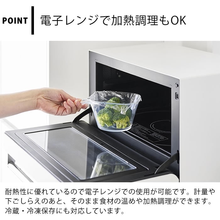 ※本製品は、家庭での調理・使用を目的としています。 ※電子レンジ以外で加熱しないでください。直火・グリル・オーブン・オーブントースター等は使用できません。 ※電子レンジの自動加熱機能は使用しないでください。 ※電子レンジで加熱の際は、耐熱温度内であっても長時間の連続使用はおやめください。 ※製品の煮沸消毒は行わないでください。 ※液体や水分の多い食品の冷凍には使用しないでください。 ※メモリは目安です。精密計量には使えません。 |