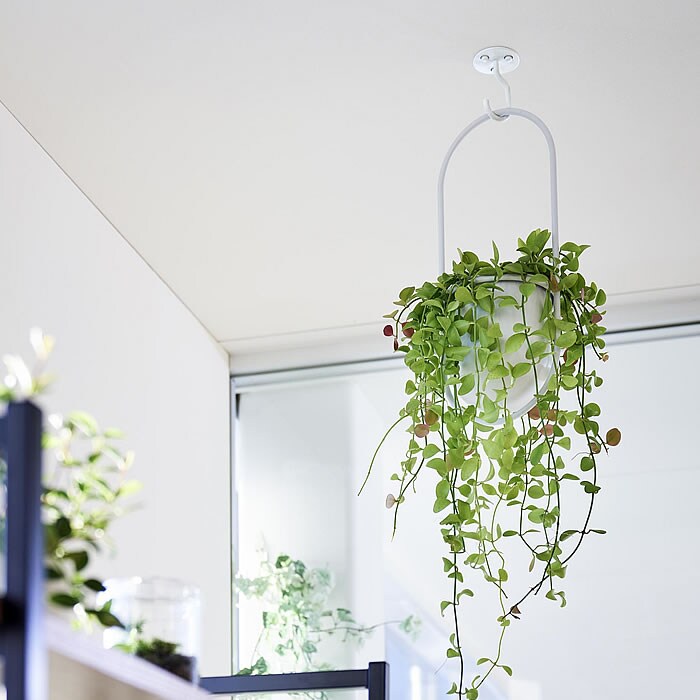 石こうボードピンで天井に簡単取り付けできるハンギングフック。観葉植物を天井から吊るして飾れるのでお部屋をおしゃれに演出できます。浮かせて飾ることができるのでお掃除もラクチン。ペットやお子様の手の届かない所に置けるので安心です。観葉植物だけでなく、モビールや風鈴、インテリアオブジェなどを吊り下げてお部屋にアクセントをつけるのもおすすめです。
