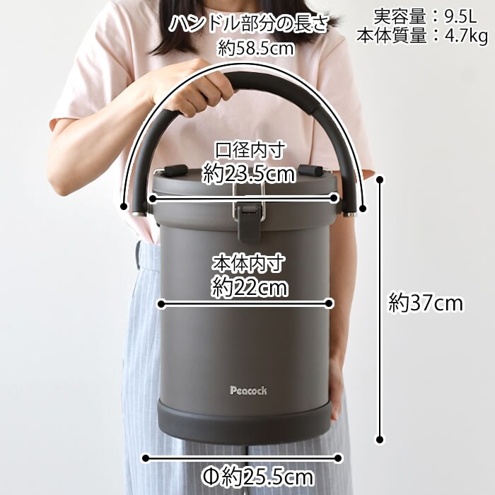 サイズ 約 WΦ25.5×H37cm(ハンドルを倒した状態) 本体内部(底からふた下面まで)の高さ:中敷あり24.8cm/中敷きなし25.4cm |