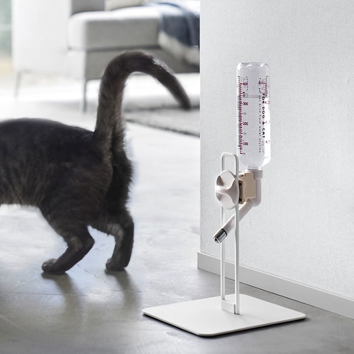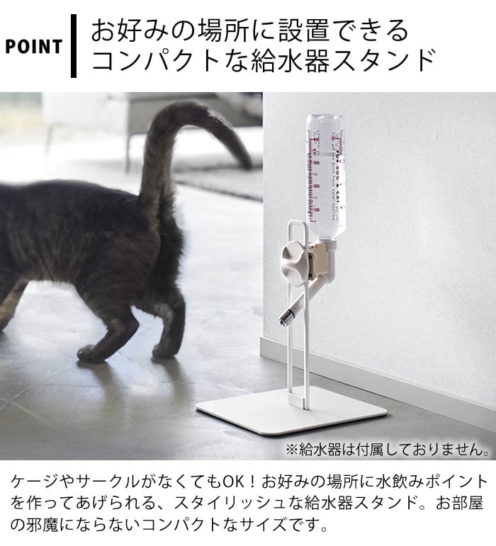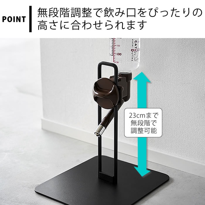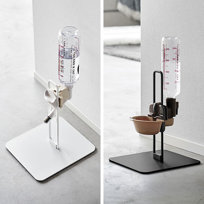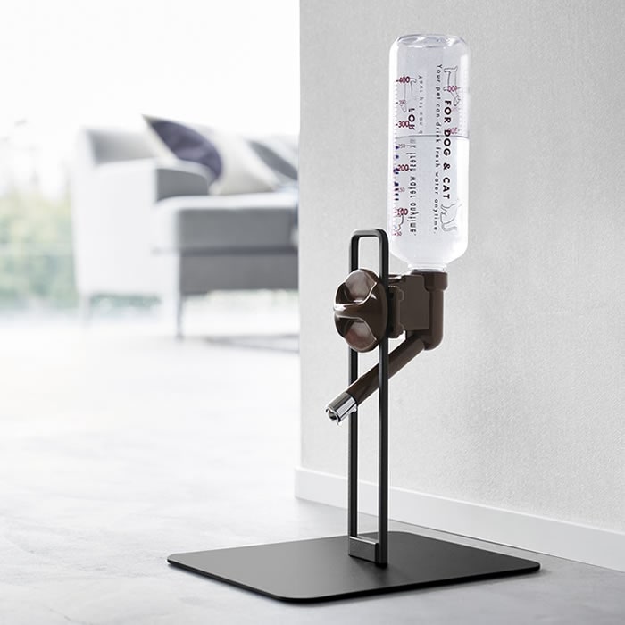 お好みの場所にペットがお水を飲めるポイントを作ってあげられる給水器スタンドです。お部屋の邪魔にならないコンパクトサイズ。飲み口の高さは無段階で調整できます。500mlまでのボトルが取り付けられ、ノズルタイプ・受け皿タイプのどちらにも対応。スタイリッシュなデザインで、お部屋の雰囲気に溶け込みます。