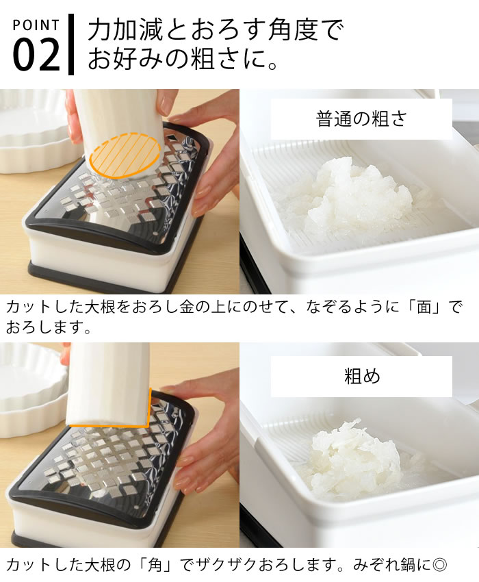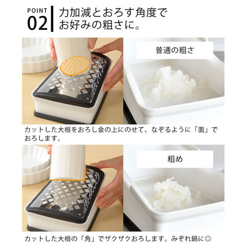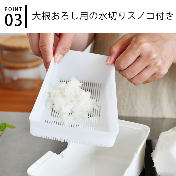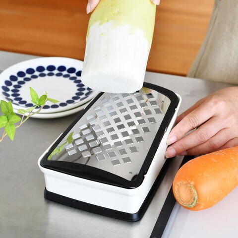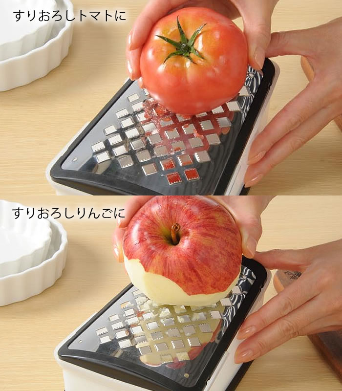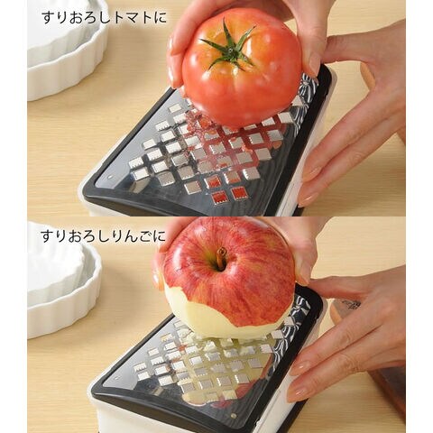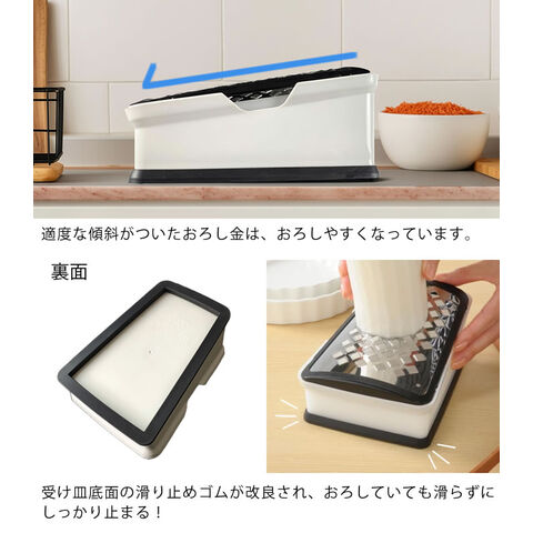 素材 おろし金:ポリプロピレン / ステンレス 受け皿・水切り:ポリプロピレン 滑り止めゴム:エラストマー |