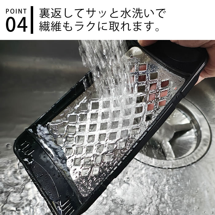 ※本品を用途以外の方法で使わないでください。 ※本品は鋭利な刃物です。手を切らないよう取り扱いに注意してください。 ※安全ホルダー等は付属しておりません。食材が小さくなったら、使用をやめましょう。 ※平らな安全な場所で使用してください。 ※直火に近づけないでください。 ※食器洗い機、食器乾燥機は使用不可。 ※ショウガ、わさびなどは水分が少ないため、おろし金の裏に貯まりやすいですが、 これは食材自体の水分の問題で、製品の問題ではございません。 その際はおろし金を裏返し、すくって取り除いてください。 |