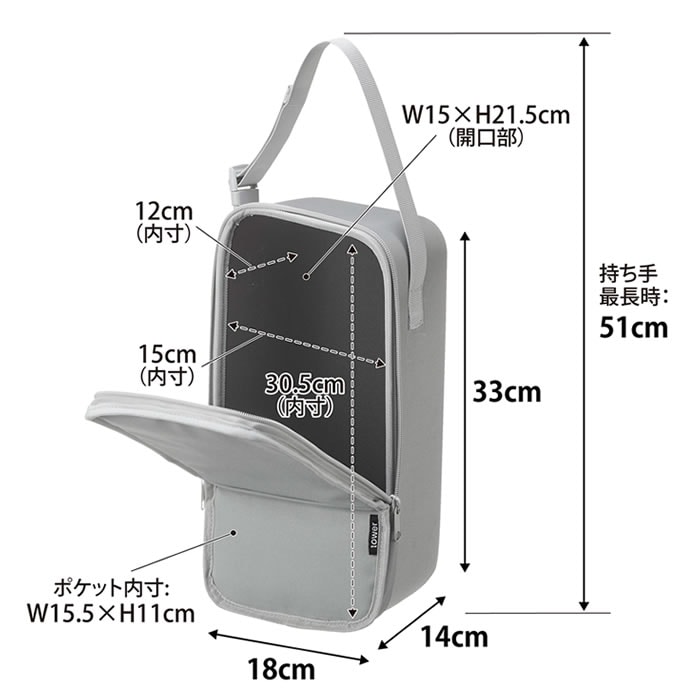 サイズ 外寸:約 W18×D14×H33cm(持ち手含まず) 持ち手最長時:約 H51cm 内寸:約 W15×D12×H30.5cm ポケット:約 W15.5×H11cm |
