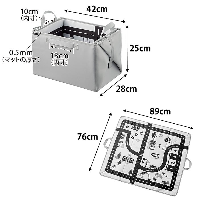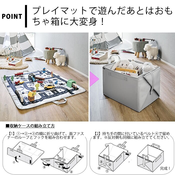 プレイマットとして遊べる 広げるとプレイマットとして遊べるおもちゃ収納ケースです。面ファスナーを外すだけで、サイズ89cm×76cmのプレイマットになります。イラストがプリントされているのでごっこ遊びや車遊びが楽しめます。側面の面ファスナーを留めると持ち手付きの収納ケースになるので持ち運びやすく、お子様と一緒に楽しんでお片付けすることができます。カラーボックスにピッタリ収まるサイズです。 ![]() ![]() ![]() ![]() ![]() ![]() ![]() ![]() |