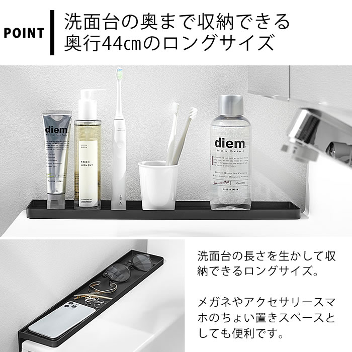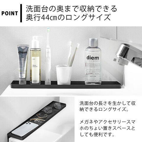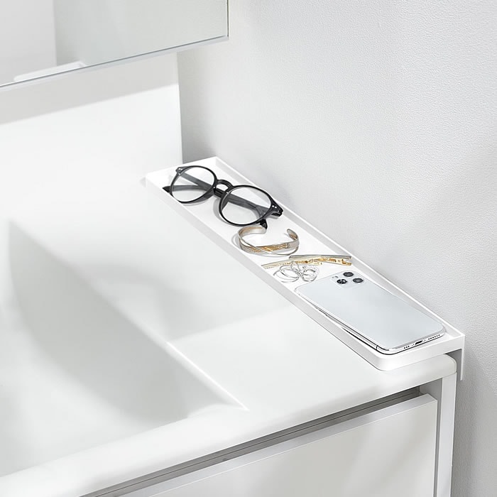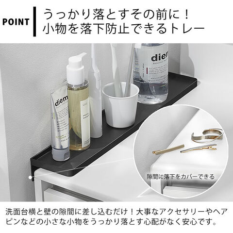差し込むだけの簡単設置 洗面台横と壁の隙間に差し込んで設置!隙間に小物が落下するのを防止し、洗面小物を置くことができるトレーです。1~2cmの隙間がある壁に面した場所に設置でき、シリコーン製のストッパーは洗面台をキズつけずトレーが安定する構造です。トレーは奥行きが44cmあるので洗面台を有効に使用することができ、メガネやアクセサリー、スマートフォンなどのちょい置きスペースとしても便利です。 ![]() ![]() ![]() ![]() ![]() ![]() ![]() ![]() |