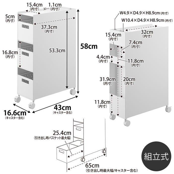 サイズ 本体:約 W16.6×D43×H58cm バスケット1つあたり:約 W15.3×D32.1×H12.2cm バスケット1つあたり(内寸):約 W14.5×D31.5×H11.5cm(仕切り板含まず) |