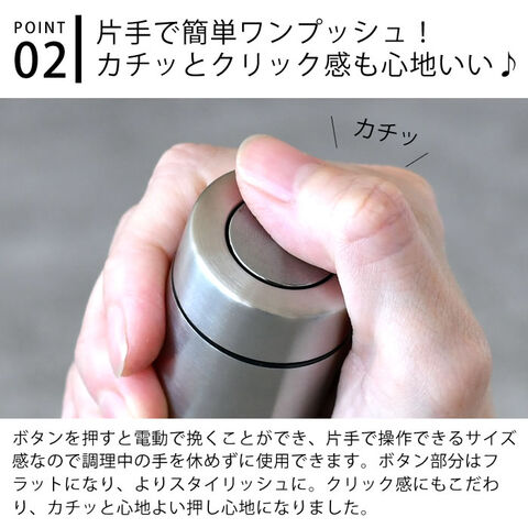 ラッセルホブス 電動ミル ソルト&ペッパー ミニの新モデル。キャビンに入る容量が従来の製品より約20%アップ。ボタン部分にもこだわり、より心地よいクリック感に。粗いものから細かいものまで、お好みの挽き加減に手軽に調節することができます。ハンディサイズでコンパクトなため、スペースをとりません。料理の最後の仕上げにも、食事中の一足しにも便利なアイテムです♪