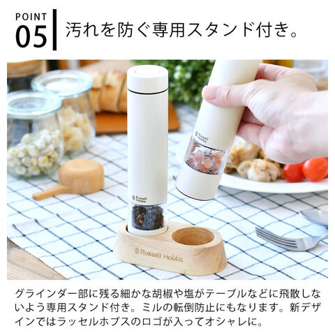 ミル 電動 Russell Hobbs ラッセルホブス 電動ミル ソルト&ペッパー ミニ 新モデル スパイスミル オシャレ 岩塩 胡椒 専用スタンド 粗挽き 細挽き 粗さ 調整 ワンプッシュ コンパクト ステンレス 充電池