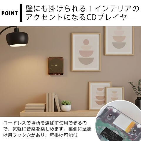 【壁に掛けてご使用になる場合】 ※本機背面にある壁掛け用フック穴に掛けて、壁に取り付けてください。 ※お使いの壁にあった適切な掛け具(フック、ネジなど)を別途ご用意ください。 【充電について】 ※内臓の充電式バッテリーの損傷を防ぐため、ご購入時のバッテリー残量は半分程度となっております。初めてご使用になる前に、バッテリーをフル充電してください。 【ESP(音飛び防止)機能について】 ※ESP機能とは、CDの読み取りを一時的に停止して、内臓メモリに音楽のデータを最大60秒分蓄積することで、振動や衝撃による音飛びを防止する機能です。 【保証期間について】 ※保証期間は、お買い上げ日から1年間となります。詳しくは取扱説明書の保証規定をご確認ください。 |