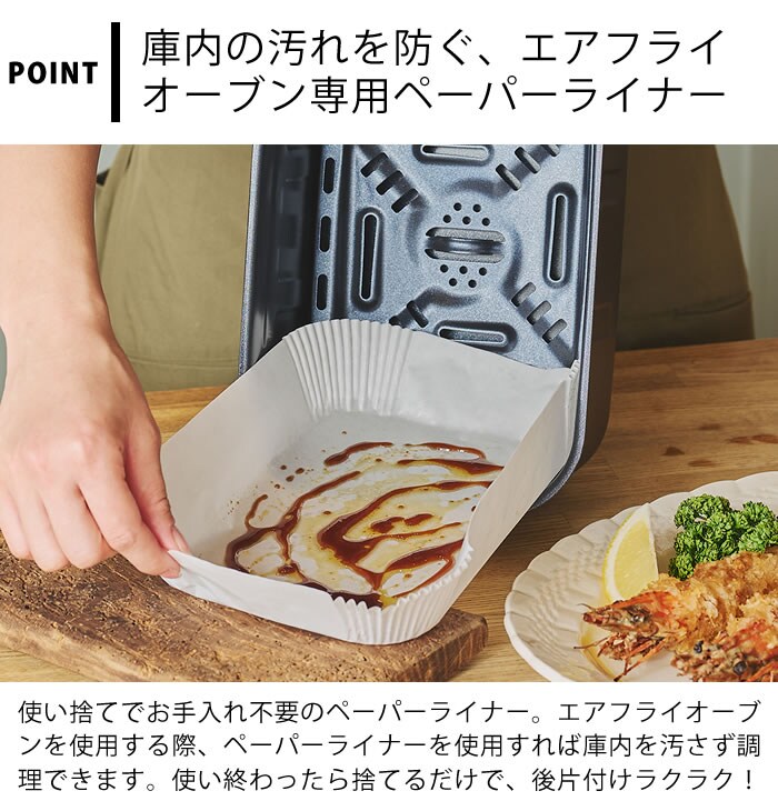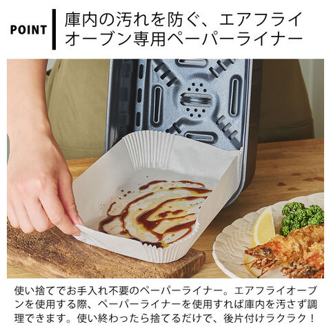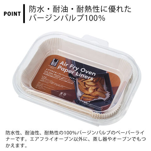 防水性、耐油性、耐熱性に優れた100%バージンパルプのペーパーライナーです。庫内にフィットする立体構造で、油はもちろん、ピザやお餅など、加熱で緩くなる食材もこぼれなくなるので便利。また、使うことで庫内が汚れにくくなり、丸洗いの回数も減るので、使用後のお手入れが格段にラクになります。エアフライオーブン以外に、蒸し器やオーブンでも使えます。