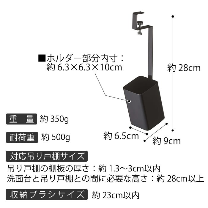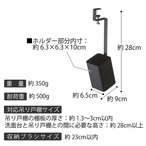 ※取り付け可能な洗面所の吊り戸棚 : 棚板の厚さ約1.3~3cm以内 ※洗面台と吊り戸棚との間に必要な高さ : 約28cm以上 ※高さ約23cm以内のブラシに対応しています |