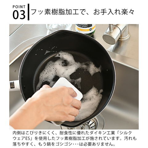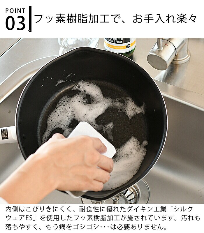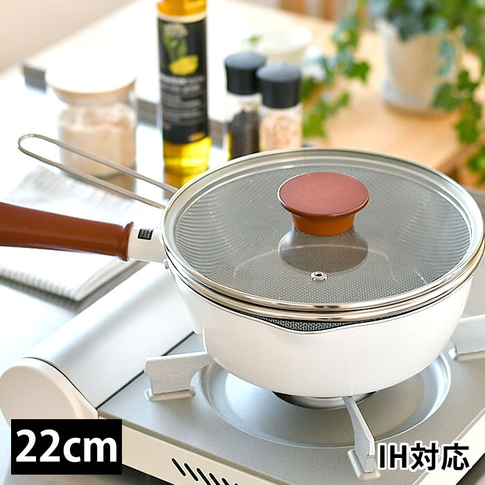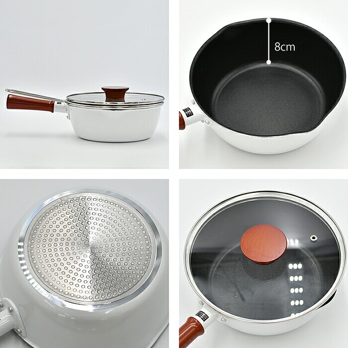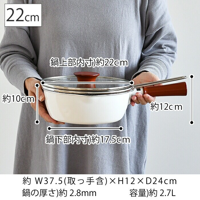 仕様 ふっ素樹脂加工 適正容量:1890ml(本体7分目が目安) 適正油量:1200g(本体5分目が目安) ガスコンロOK、IHクッキングヒーターOK、金属ヘラ、お玉OK※1角のとがった金属製のヘラなど、鋭利な道具の使用はさけてください。 |