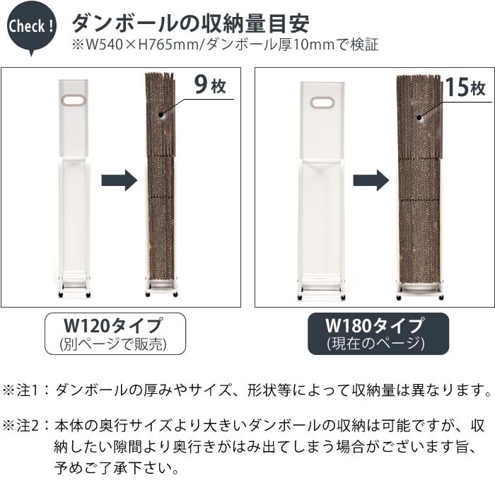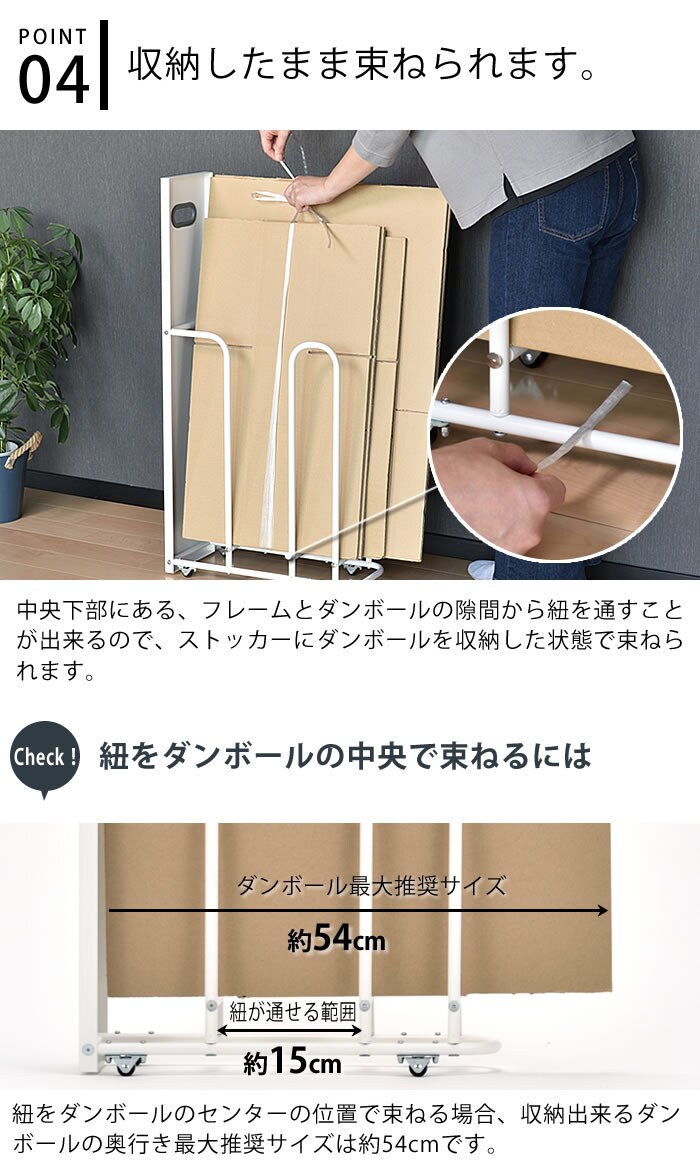 収納量目安 ダンボール最大約15枚収納(W54×H76.5cm/ダンボール厚0.1cmにて検証) ※ダンボールの厚みやサイズ、形状等によって収納量は異なります。 |