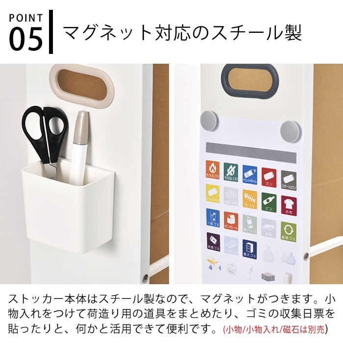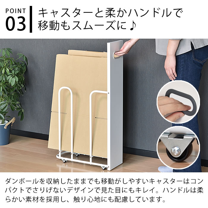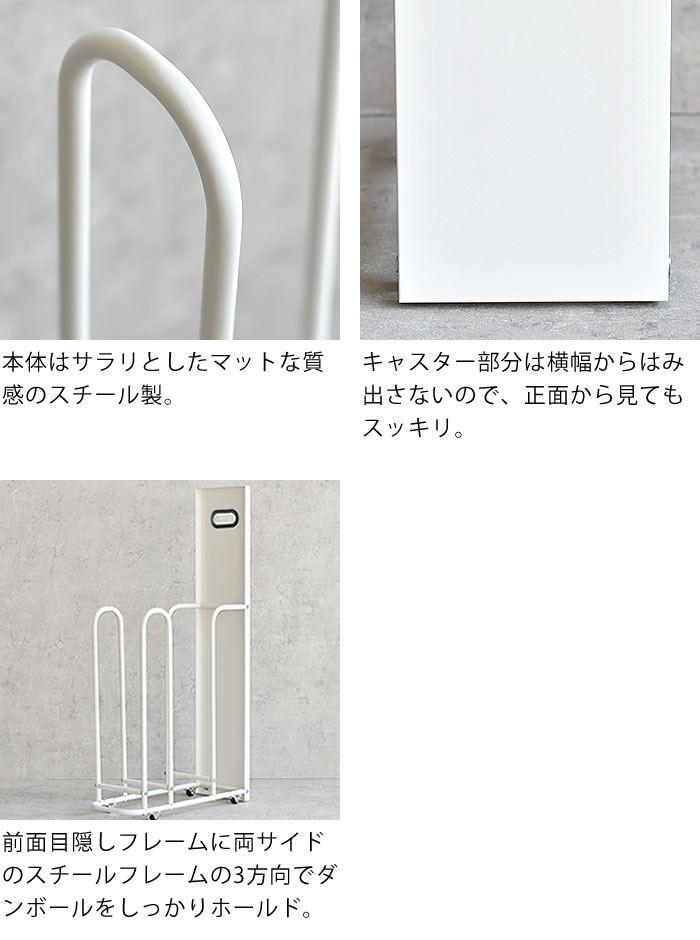 ダンボールをスッキリ一時保管 ネットショッピングなどで溜まる一方のダンボール。ごちゃごちゃしてスッキリしないプチストレスを解消してくれる ダンボールストッカー。横幅が18.8cmとスリムでキッチン台やカウンター下、玄関やシューズクローゼットなどにも 邪魔にならずスッキリと収まります。また、高さのある前面パネルがダンボールを目隠ししてくれるので見た目もよりスッキリ。 ダンボールも収納したまま紐で束ねられますし、キャスター付きなので移動もラクラク。本体はスチール製なので マグネットにも対応。ハサミやカッター、手袋など小物類をまとめたりも便利です♪ ![]() ![]() ![]() ![]() ![]() ![]() ![]() ![]() ![]() ![]() ![]() ![]() ![]() ![]() ![]() |