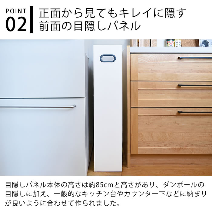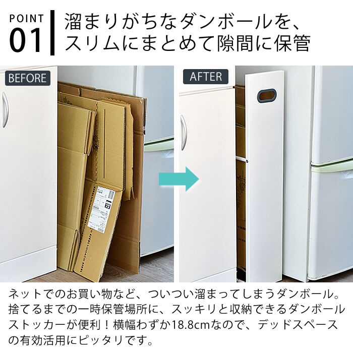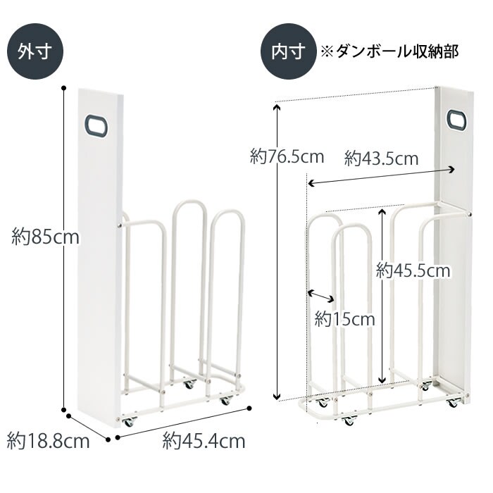 サイズ 外寸:約W18.8×H85×D45.4cm 内寸(ダンボール収納部):約W43.5×H45.5~76.5×D15cm ※収納できるダンボールの奥行き最大推奨サイズ:約54cm |