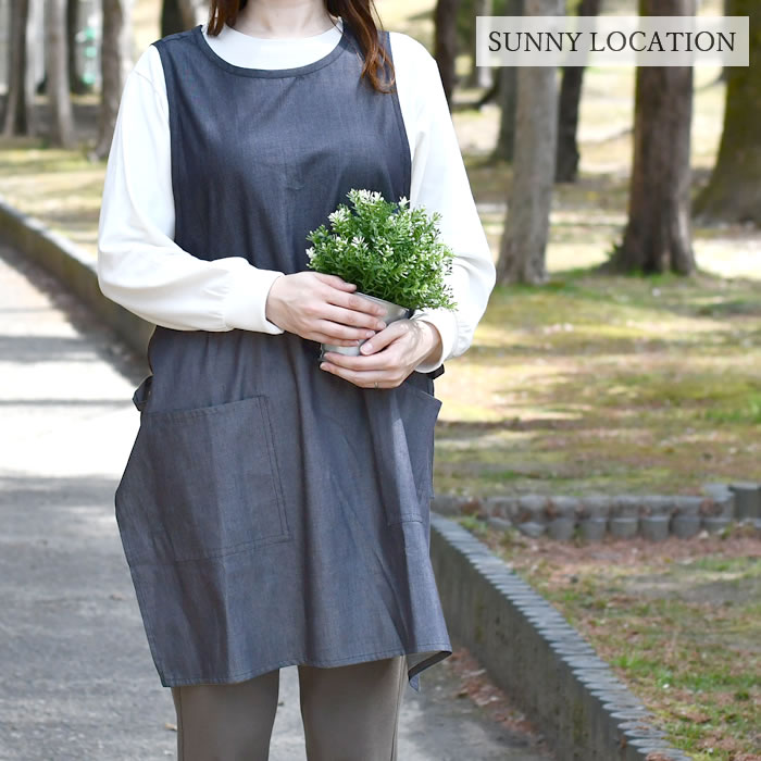 サニーロケーション ビブエプロン デニム エプロン おしゃれ ナチュラル エプロン ショート丈 デニム ライトオンスデニム 綿100% 柔らかい 軽い 日本製 シンプル かわいい ポケット フリーサイズ 2WY プルオーバー レディース 大人