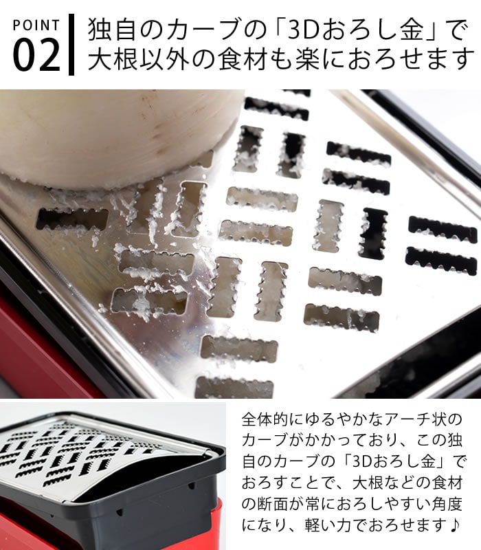 立体的な縦横交互の3Dおろし金で、軽い力でキメの細かい大根おろしができます。