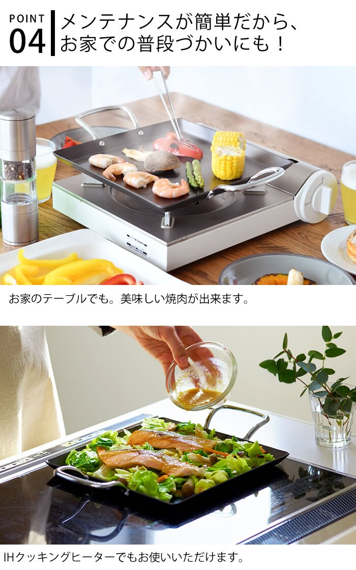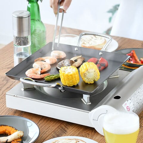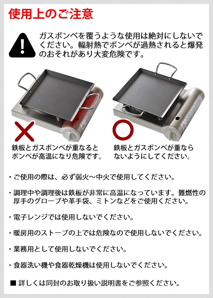 ※ガスボンベを覆うような使用は絶対にしないでください。輻射熱でボンベが過熱されると爆発のおそれがあり大変危険です。 ・ご使用の際は、必ず弱火~中火で使用してください。 ・調理中や調理後は鉄板が非常に高温になっています。難燃性の厚手のグローブや革手袋、ミトンなどをご使用ください。 ・電子レンジでは使用しないでください。 ・暖房用のストーブの上では危険なので使用しないでください。 ・業務用として使用しないでください。 ・食器洗い機や食器乾燥機は使用しないでください。 |