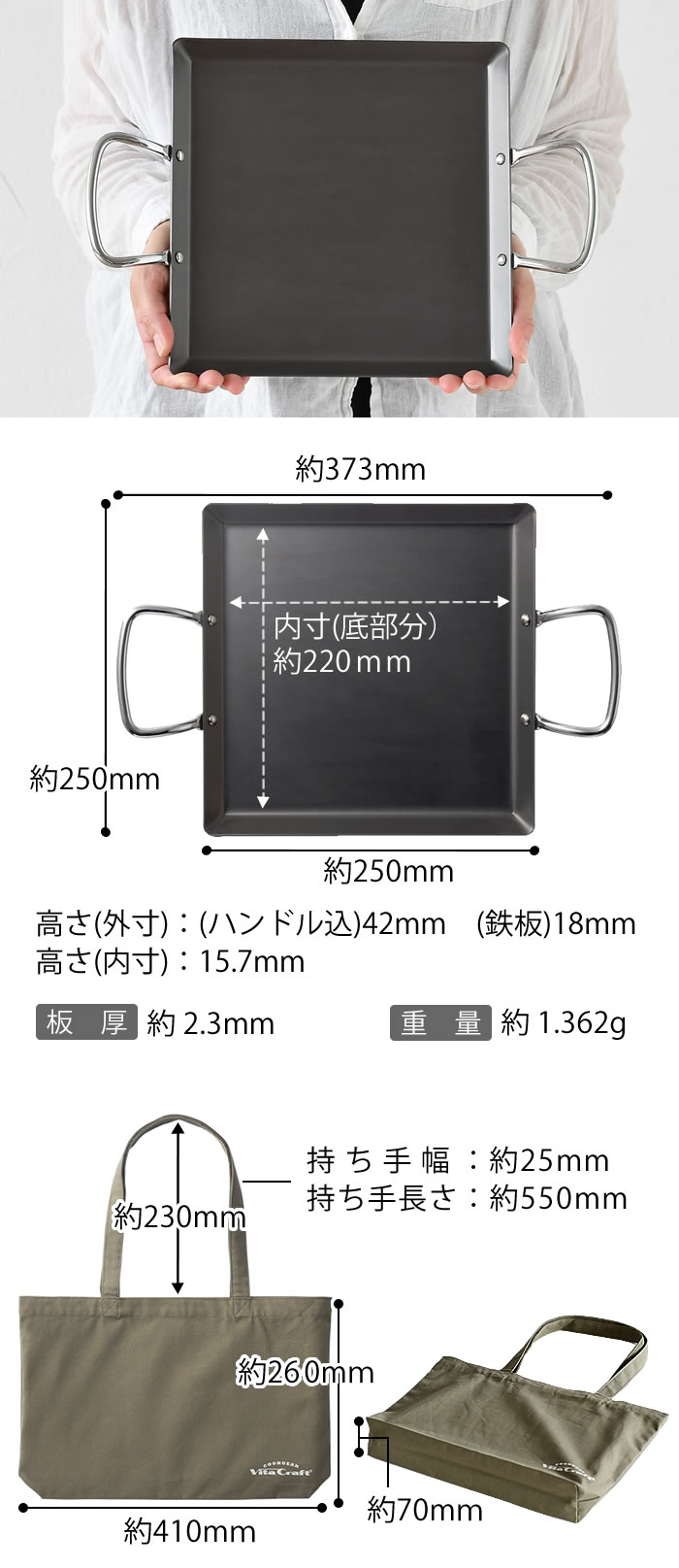 鉄板サイズ(外寸) 外寸(ハンドル込):約 W373×H42×D250mm 外寸(鉄板部分):約 W250×H18×D250mm 鉄板底部内寸:約 W220×D220mm |