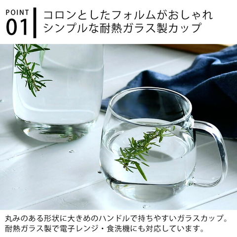 コロンとした形状に、持ちやすい緩やかなハンドルがおしゃれなガラスカップ。電子レンジ、食洗機に対応する使い勝手の良さに、様々なテイストのお部屋に調和するシンプルなデザインで日々の暮らしに寄り添います。350ml、450ml、550mlの3サイズがあるので、ドリンクの種類や用途に合わせてお選びいただけます。