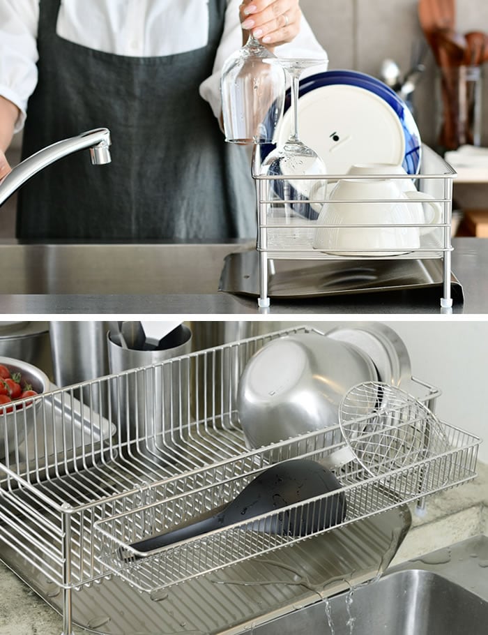 ※食器の形状によっては立たない場合がございます。 ※不安定な場所に水切りかごを設置して使用しないで下さい。 ※食器を必要以上に積み重ねて乗せる事は危険ですので、おやめ下さい ※最初に使用する時は食器用洗剤をつけてスポンジ等で十分に洗い、水気を拭き取って下さい。 ※たわし又は研磨剤を含んだ洗剤で洗いますと傷がつく場合がございます。 ※時々は食器用洗剤を付けてスポンジ等で十分に洗って下さい。その後水気を十分に乾燥させて下さい。 ※塩分や酸等を含んだ汚れ、鉄やアルミ等の異種金属に製品を接触したまま放置しないで下さい。腐食発生の原因になります。 ※製品改良の為、仕様の一部を予告なく変更する事がございます旨、予めご容赦下さい。 |