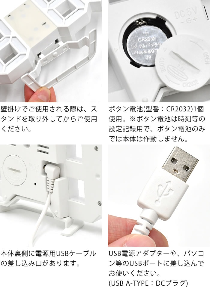 仕様 ■置き・掛け兼用(壁掛けの際は、本体下部のスタンドを取り外してください。) ■機能:LED時計機能、温度表示(0℃~122℃)、カレンダー機能(2000年1月1日~2099年2月28日まで)、アラーム機能(スヌーズ機能はなし) ■自動調光機能(明るさ70%:PM7:00~AM5:59、明るさ100%:AM6:00~PM6:59) ■時間精度:月差±45秒以内(25℃の常温にて) ■電圧:DC5V ■使用電池:ボタン電池(型番:CR2032)1個 ■防水機能:なし ■付属品:電源用USBケーブル(USB A-TYPE:DCプラグ)、ボタン電池、取扱説明書/保証書 |