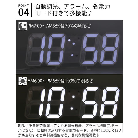 数字が浮かび上がる! デジタル数字が浮かび上がり、お部屋の照明にもなるLED時計。 ホワイトでシンプルなボディは、置いてあるだけで韓国風でおしゃれ♪ 置き型だけでなく、壁掛け時計としても使えます◎夜間は自動で明るさを調節する機能や、時刻以外に日付と 温度を表示させる機能もあり機能面もバッチリ! 寝室やリビング等、お部屋のアクセントにお使いください♪プレゼントとしても大変喜ばれます◎ ![]() ![]() ![]() ![]() ![]() ![]() ![]() ![]() ![]() ![]() ![]() ![]() |