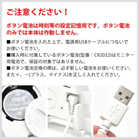 ※ボタン電池は時刻等の設定記憶用です。ボタン電池のみでは本体は作動しないため、付属の電源用USBケーブルもご使用ください。 ※次のような場所では使用しないでください。 ・長時間直射日光が当たる所。・熱風が当たる所。・火気に近い所。・不安定な所。 ・強い磁気や振動のある所。・水や水蒸気に触れる所。・高温多湿になる所。 ・多量の油分や薬品等による揮発成分やガスが発生する所。・小さなお子様の手が届く所。 ・温度が0℃以下、40℃以上になる所。 ※落としたり、強くぶつけたりしないでください。 ※電池の使い方については、説明書よくお読みの上正しく行ってください。使い方を間違えると 液漏れや破損のおそれがあり、機械の故障やケガなどの原因になります。また、小さなお子様が誤飲するおそれがありますので、 外した電池は手の届かない所に置いていただくようお願いいたします。 ※分解や改造は絶対にしないでください。火災、感電、ケガの原因になります。 ※時計を使わない時は、電池を外してください。電池を入れたままにしておきますと電池の液が漏れて時計やその周辺を傷めたり、人に危害を与える場合があります。 |