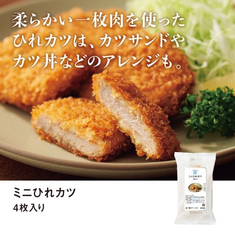 ◆ミニひれカツ 4枚入り:柔らかな一枚肉を使った、ジューシーなひれカツ。そのままでもお楽しみいただけますが、お好みでソースやポン酢などとご一緒に。カツサンドやカツ丼にもアレンジがしやすい便利なサイズとおいしさです。