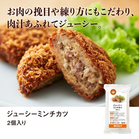 ◆ジューシーミンチカツ 2個入り:肉汁あふれる、ジューシーな食感。お肉の挽目、練り方にこだわって、ジューシーな食感を追求した、食べ応えのある一品。おろしソースや、ウスターソースをかけてお召し上がりいただくのもおすすめです。