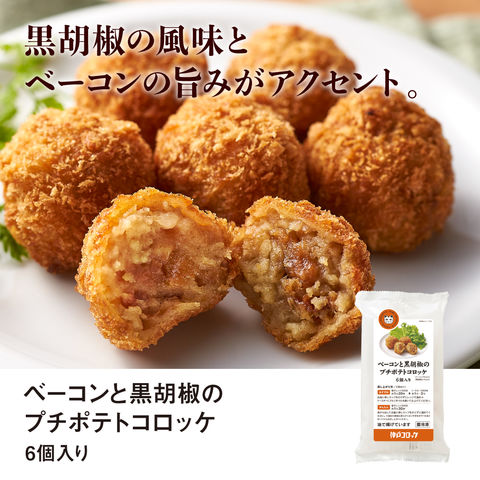 ◆ベーコンと黒胡椒のプチポテトコロッケ 6個入り:ベーコンの旨みにパンチの効いた黒胡椒の風味が、じゃがいもの美味しさを引き立てます。小さめサイズで、おかずの1品にもおつまみにも幅広くお使いいただけます。