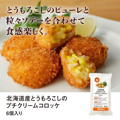 ◆北海道産とうもろこしのプチクリームコロッケ 6個入り:みんなのほっぺに大満足。北海道産とうもろこしのソテーとピューレを合わせました。たのしい食感とクリーミーで優しい甘みは、お子様にも人気の味わいです。