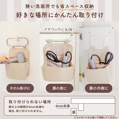 ●フック付きなのでタオルかけや洗面所の扉の表裏に取り付けられます。